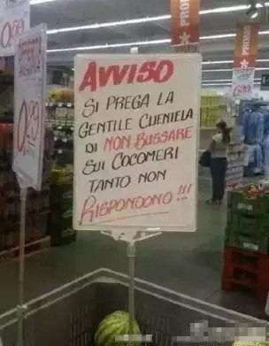 日前,新浪微博用户@孤岛守护者发微博称,意大利的一家超市立了一个牌子:“尊敬的顾客,请您不要再敲西瓜了,它们是真的不会回应的!!!”