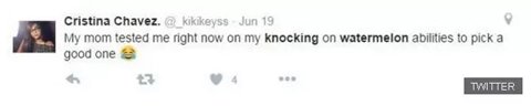 这位国外网友在推特上发文称:我妈正在考我通过敲来挑西瓜的技能呢。