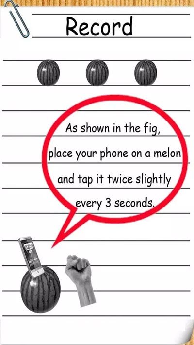 方法就是把手机放在西瓜上,大概以3秒敲两下的频率来敲西瓜,APP就会能告诉你这个西瓜是否成熟。