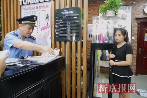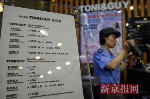 下午,在中关村南路一家名叫“TONI&GUY”的理发店内,工作人员暂停理发业务,海淀工商分局的执法人员一一检查店内的营业执照、商标注册资料、会员卡办卡资料等。