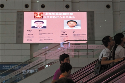 6日,上海铁路法院公布的10余名“老赖”照片等信息在铁路上海站候车大厅的屏幕上滚动播放。