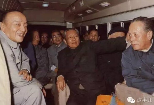 杨尚昆、习仲勋与广东省领导乘面包车下乡。