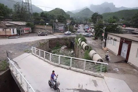 ▼2016年7月21日,“7·21”中一片狼藉的街道,早已恢复正常,曾被洪水冲出的大坑,作为河道已被扩宽,并修建了一座小桥。 新京报记者 大路 摄