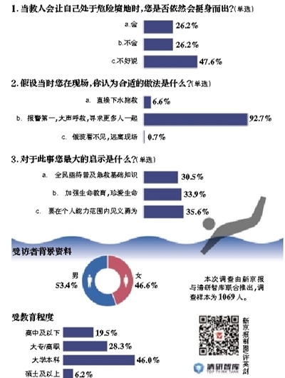 7月17日,敦煌市发生一起溺水事件:一女子酒后欲自杀被同伴救起,孰料该女子第二次跳入水中,被同伴及好心人施救,不幸的是包括自杀女在内共有6人溺亡。这场悲剧在舆论场中再次引起“to be or not to be”式的争论。在这场争论中,我们需要关注哪些问题?本期“京报调查”(新京报与清研智库联合推出)就此展开调查。
