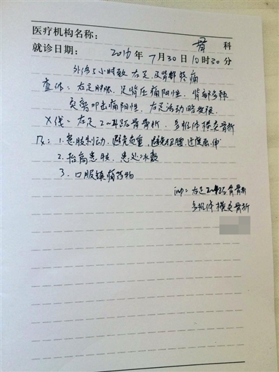 印先生母亲的就诊记录显示,事故导致其头部被砸伤,右顶头皮血肿,右足肿胀,足背压痛阳性,右足2-4跖骨骨折,多椎体横突骨折。