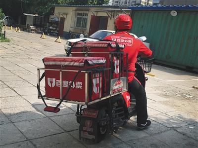 昨日,在海淀区西三环北路86号院,百度“生态厨房”展览路店,一名百度骑士准备骑车离开。