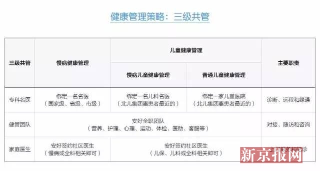 三级共管健康管理策略是由社区全科医生、安好团队内的健管医生、三甲医院名医共同配合构成家庭医生团队,为套餐签约家庭提供更高质量的基础医疗和公卫服务。