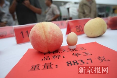 参加比赛的白桃、蟠桃和油桃也都是严格标准万里挑一的,参赛的白桃都要在半斤以上,蟠桃和油桃也都要超过3两才能见到评委。除了个头,参赛的大桃成熟度都要保持在八成熟左右,着色度不低于70%,而且还要果形端正,无病、无伤,这样的要求堪比大桃界的选美。截至记者发稿时,评选出的大桃王品种名称为“华玉”,最大个头887.3克。而普通的桃子里七八两就算个头很大了。