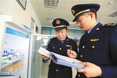 今年3月23日,山东疫苗事件发生后,安徽省淮北市相山区桓谭市场监督管理所执法人员在社区卫生服务站对二类疫苗的储存、批次等环节进行检查。 图/视觉中国