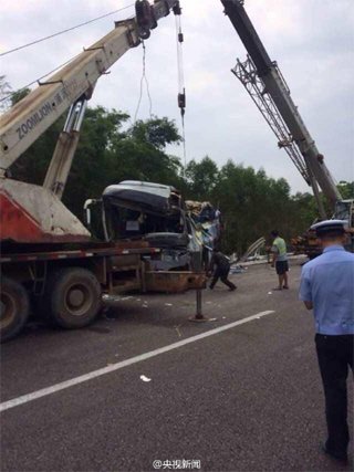 据网传的现场照片和视频显示,事发路段放置着至少9具尸体,均已用布料遮盖住;路边的护栏也被撞得散落在地上;涉事车辆受到撞击后严重变形,侧翻在高速公路外的边沟里,前部、侧部车窗玻璃全被撞碎,车头被撞出大坑。救援人员赶到后,车身被起重机吊到路边。