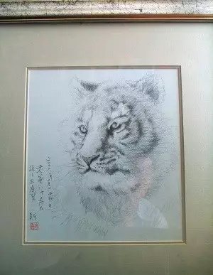 苏民家在紧邻国家大剧院的西交民巷一栋住宅楼里,客厅里挂着儿子濮存昕的画作,上书“中秋老爸80寿辰,孩儿画虎贺,小新”。这是2006年生日时濮存昕给他画的贺寿图。(濮存昕小名儿叫新新)