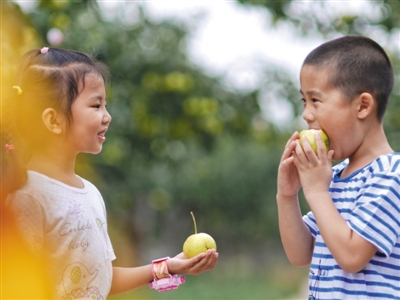 9月4日,在京白梨果树园内,两个小朋友摘下梨后品尝起来。新京报记者 王嘉宁 摄