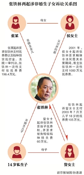 另据记者了解,张铁林的另一个非婚生儿子的母亲訾女士,诉张铁林索要孩子抚养权,预定将于本月底审理。张铁林认为訾女士未尽到抚养义务,索要儿子的抚养费一百余万元,法院也已立案。