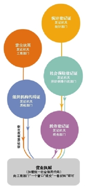 改革实施后,申请人在办理相关登记注册时,只需要填写“一张表格”,向工商部门“一个窗口”提交“一套材料”,就能拿到加载统一社会信用代码的营业执照,不必再到人力社保部门和统计部门办理相关许可证。
