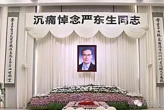 “政事儿”(微信ID:gcxxjgzh)注意到,在遗体告别仪式上,习近平、李克强、张德江、俞正声、刘云山、王岐山、张高丽七常委,江泽民、胡锦涛两位前总书记,刘延东、孙春兰、李源潮、赵乐际、韩正五位现任中央政治局委员,李鹏、朱镕基、温家宝三位前总理,吴邦国、宋平、曾庆红、李岚清、吴官正、贺国强等退休常委,赠送花圈,对严东生予以悼念。
