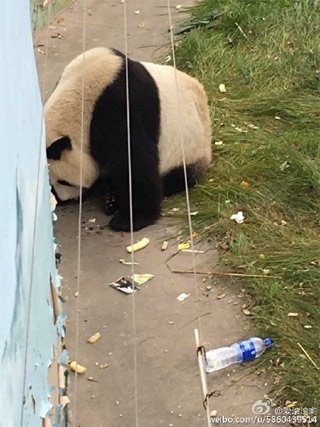 熊猫采食游客投喂垃圾。图片来自网络