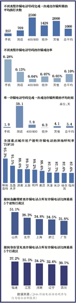 数据显示,全国诈骗电话的成功率约为0.1%,即犯罪分子平均每拨打(含主叫和被叫)约1000次诈骗电话,就会有一次接近成功。其中使用手机拨打的诈骗电话的成功率最高,为0.28%,即平均只需要用手机拨打约357个诈骗电话,就会有一次接近成功。