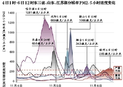 5日夜间至6日上午,受东北地区污染传输影响,山东省烟台市、潍坊市、青岛市、日照市、枣庄市,江苏省徐州市、宿迁市,安徽省淮北市、亳州市相继出现重度以上污染。