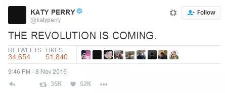 作为希拉里最忠诚的支持者之一,“水果姐”(Kate Perry)在推特上说“革命要来了”。