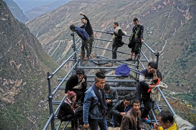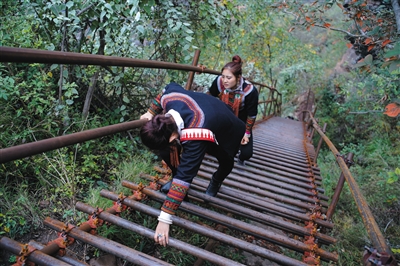 11月9日,在通过105级最长的台阶过程中,新娘勒尔拉则中间休息了两次,她说很多年没爬过这么陡的山了,感觉很累。勒尔拉则是“悬崖村”钢梯路修好后,迎来的第一个新娘。