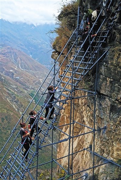 今年8月,经新京报报道后,“悬崖村”开始使用钢管搭建“天梯”,以代替老旧藤梯。10月底,新“天梯”主体工程完工,村民上山耗时比先前缩短一个小时。