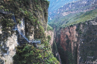 新修的钢梯从山腰向峡谷方向开始改道,可以看到更多的雄伟的峡谷景观。