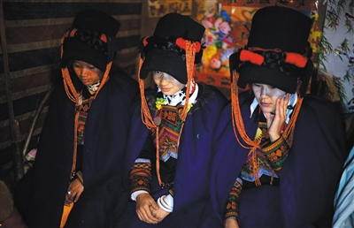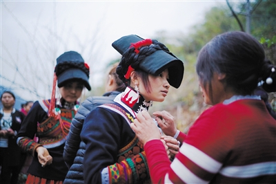 新娘勒尔拉则换上彝族婚礼服装,戴上首饰。