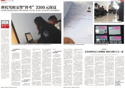 新京报11月16日刊登了摩托驾照交警“替考”3300元保过的报道。