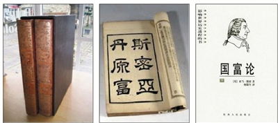 斯密在生前将《国富论》(以及《道德情操论》)反复修改重版。初版百年后,严复才着手中译工作,于1901年完成,随即由上海南洋公学(交通大学前身)译书院出版,书名为《原富》;后又于1931年由商务印书馆重排出版。图为1776年英文版《国富论》、清末严复译本、杨敬年2006版译本。
