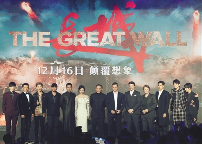 《长城》全阵容亮相:陈学冬、郑恺、鹿晗、张涵予、刘德华、景甜、张艺谋、马特·达蒙、佩德罗·帕斯卡、威廉·达福、彭于晏、林更新、王俊凯(从左至右)。新京报记者 郭延冰 摄