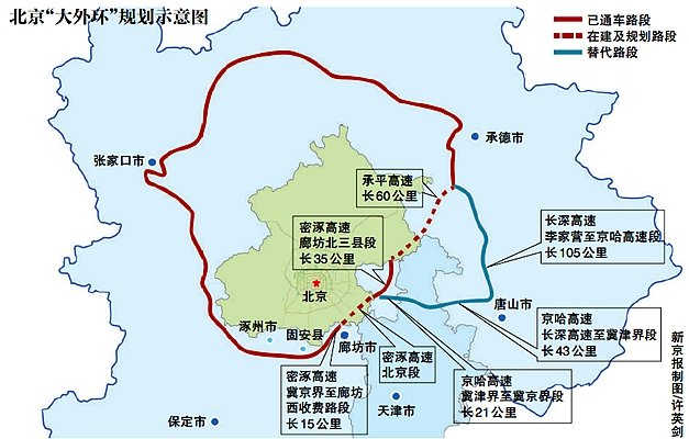 为尽快实现区域互联互通,交通运输部提出,先期通过替代路线来实现大外环功能,由河北省境内的长深、京哈高速公路代替承平高速公路,形成大外环替代路线。