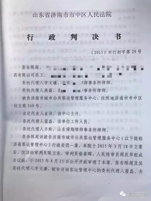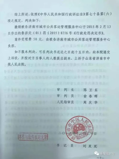 ▲12月30日,法院判决撤销济南市城市公共客运管理服务中心于2015年2月13日作出的《行政处罚决定书》。