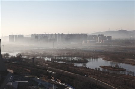 昨日9时56分,北京首钢旧厂区,远处的雾霾慢慢弥漫过来。图/视觉中国