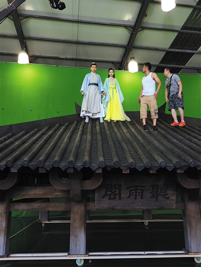 钟汉良和Angelababy站在亭子上这场戏就是绿幕拍摄的。