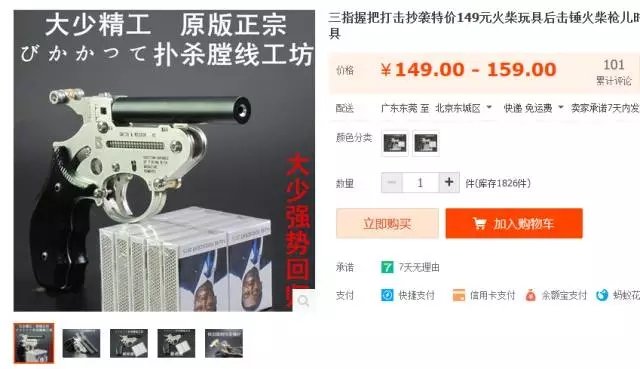 回到株洲这一案件,叶某称,他是在淘宝网上花148元购买、给儿子用作玩具的。而在淘宝网上,我们查询到,价格在148元左右的火柴枪有好几款,有的称“只能听响,无法改装”,有的则称“可以打出3米左右”。而另有媒体报道,2016年3月份,沈阳一男子网购火柴枪改成钢珠枪被刑拘。