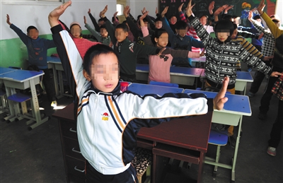 2013年12月11日,石家庄某小学学生在教室内演示“防霾”武术健身操。图/视觉中国