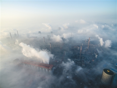 2016年12月22日,邯郸,钢铁厂烟囱穿过晨雾。 新京报记者 王子诚 摄