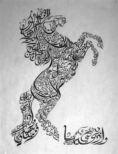这张阿拉伯文书法画是马哈茂德·达尔维什一首名为“Take My Horse and Slaughter It”诗歌的诗词。书法从马首到马尾一次完成,右下角是作者的名字。