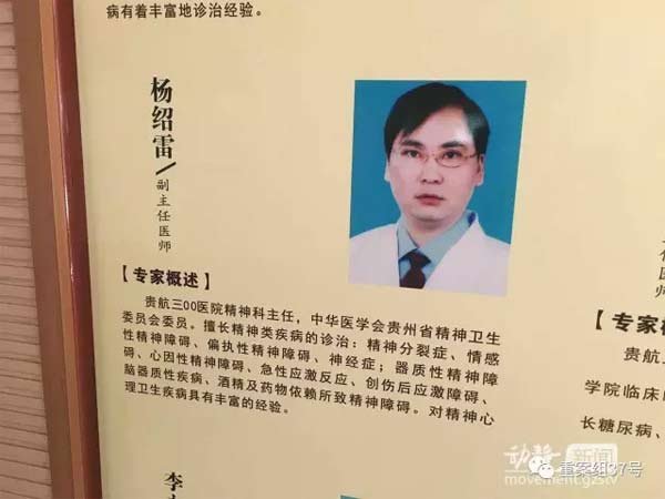 公开资料显示,杨绍雷职称为副主任医师,毕业于贵阳医学院临床医学系,系中华医学会贵州省精神卫生委员会委员,擅长精神科疾病的诊疗。