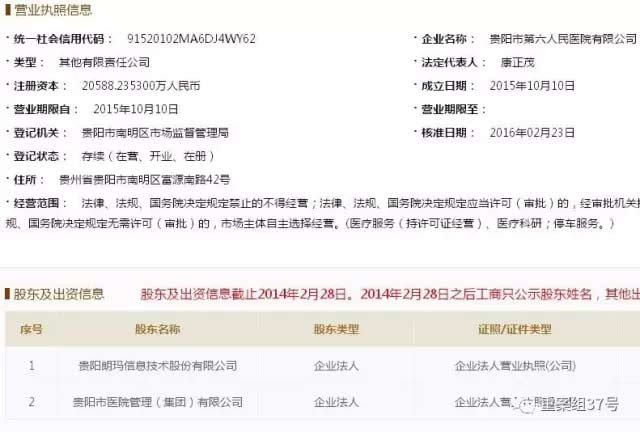 此前的2015年11月,上市公司朗玛信息曾发布公告,拟增资1.41亿元,获得贵阳六医院66%股权。重案组37号探员注意到,在工商信息中,朗玛信息与贵阳六院的多位高管名字相同。