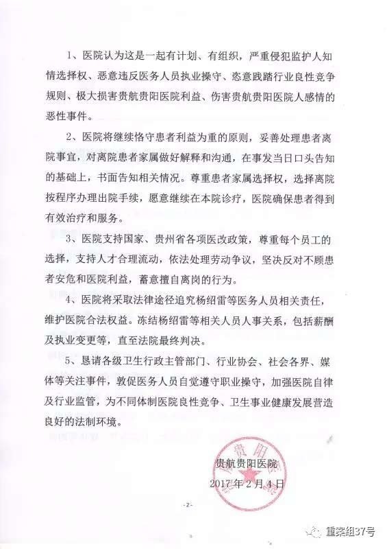 贵航贵阳医院表示,该院同时有4名医师、7名护士未履行相关手续离岗。上述医院将该起事件,定义为一起“有计划、有组织,严重侵犯监护人知情选择权、恶意违反医务人员执业操守、恣意践踏行业良性竞争规则、极大危害贵航贵阳医院利益、伤害贵航贵阳医院人感情的恶性事件。”