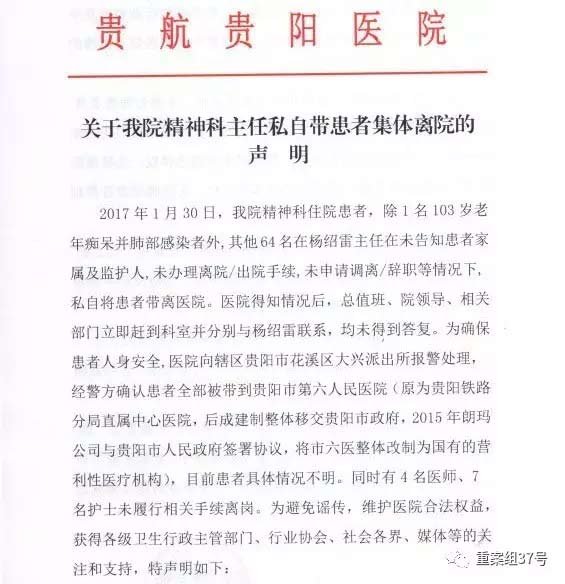 重案组37号(微信ID:zhonganzu37)注意到,2月4日下午,贵航贵阳医院在其官网“通知公告”一栏,发布了一份《关于我院精神科主任私自带患者集体离院的声明》。