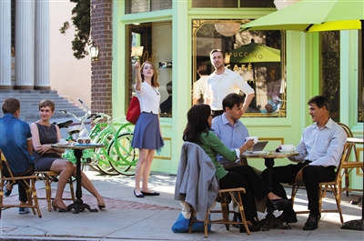处于热恋中的米娅身着暖色系的大裙摆过膝长裙与塞巴斯汀走过晚霞笼罩的洛杉矶街头,这类翻领式裙装,很适合艾玛的气质。“这个颜色恰巧符合角色当时的心情,我们只是直接地呈现出剧情应有的服装,不是为了效法什么。”