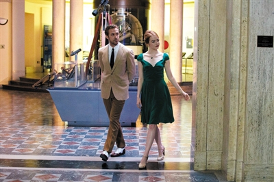 充满古典气质的绿裙参考了1945年的影片《一个明星的诞生》中朱迪·嘉兰的造型。“这件衣服我想像是那种观众一看就知道这是米娅可以在复古商店里淘到的衣服,同时裙摆的设计来自于女性化视角,很高兴达米恩尊重了我的意见,要知道很多男导演都喜欢女星多露点腿……”