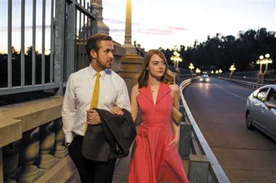 随着米娅与塞巴斯汀进入热恋,米娅穿着的颜色也转为淡色,比电影刚开始的色彩整体变得更为简单清爽。一件蓝色牛仔背心加上粉色铅笔裙,轻盈地走在洛杉矶的大街上与恋人奔向下一个约会地点。