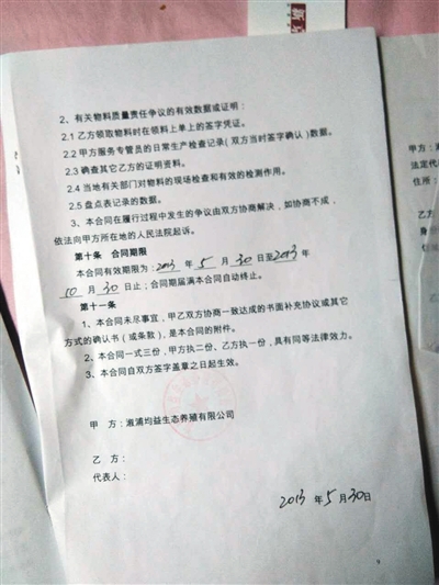 彭洲村养殖户向新京报记者出示的养殖合同(溆浦均益生态养殖有限公司为大康农业子公司)。