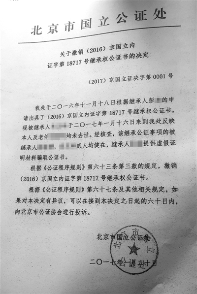 70岁的肖丽,多次带着女儿前往昌平区不动产中心和北京市司法局证明身份。在多方协调下,1月20日,国立公证处出具了撤销继承公证的决定书,同时告知昌平区房管局。