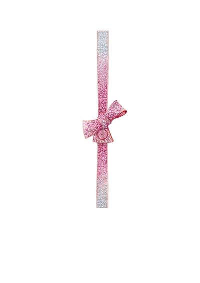 腕表顶部缀有蝴蝶结,打开即会露出表盘。玫瑰金表壳,镶嵌圆形粉红色蓝宝石,玫瑰金手链除了粉红色蓝宝石外镶嵌有圆形钻石,石英机芯。