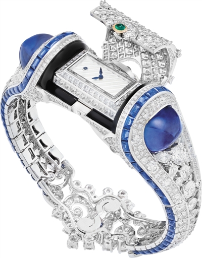 灵感来源于海洋之美,将隐秘式腕表的高超技术与高级腕表的雅致美态合二为一。手动上链机械机芯,手链为白k金,黄k金,各种形式切割的钻石、蓝宝石、祖母绿,尤其是2颗共重27.34克拉的斯里兰卡蓝宝石。