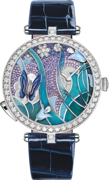 此款表搭载一枚极致精巧的自动上链机械机芯,以刻画翩翩蝶舞,随着表盘右侧时针和分针的移动,蝴蝶会根据动力储存的更迭增减,连续拍动蝶翼,栩栩如生。表盘有钻石、蓝宝石、珍珠母贝,采用多种珐琅工艺。